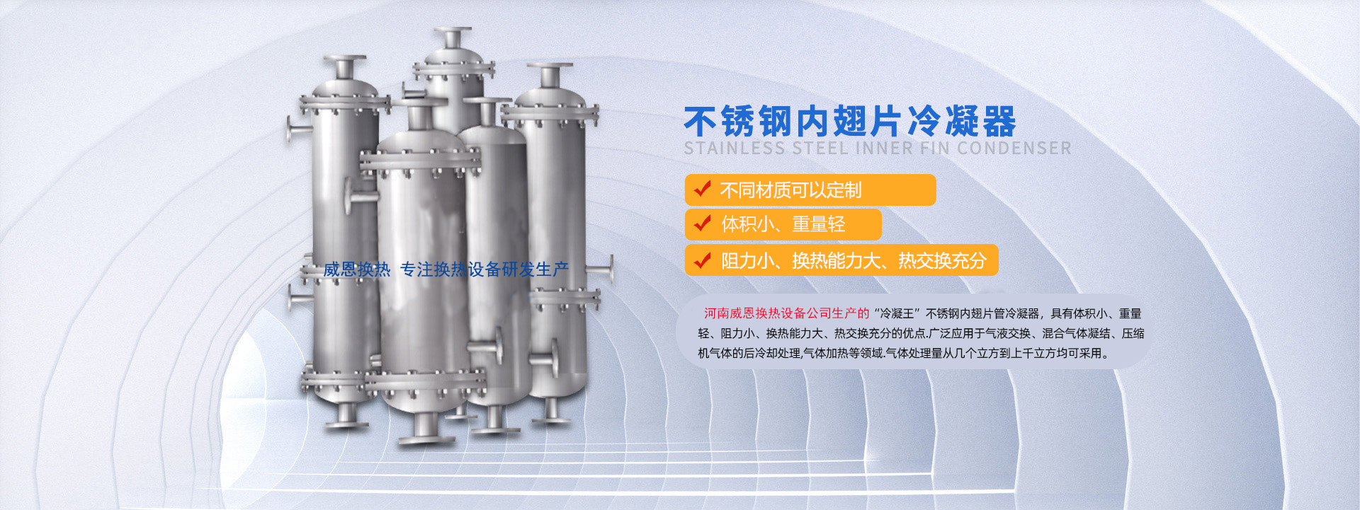 河南威恩換熱設(shè)備有限公司是一家專業(yè)生產(chǎn)制造螺旋板式換熱器、列管式換熱器、節(jié)能換熱設(shè)備的廠家,集科研、設(shè)計(jì)、生產(chǎn)、銷售、工程安裝、調(diào)試為一體的技術(shù)型企業(yè)。公司成立以來一直致力于節(jié)能環(huán)保換熱設(shè)備的研發(fā)生產(chǎn),主要產(chǎn)品包括螺旋板換熱器、列管式換熱器、內(nèi)翅片冷凝器以及鋼制儲(chǔ)罐、反應(yīng)釜等的研發(fā)設(shè)計(jì)與銷售。公司研發(fā)生產(chǎn)的螺旋板式換熱器,傳熱效率高、可靠性高、阻力小、不易堵塞、可有效回收低品位熱能,已經(jīng)廣泛應(yīng)用到化學(xué)、石油、溶劑、醫(yī)藥、食品、輕工、紡織、冶金、軋鋼、焦化等行業(yè),取得了良好的效果,得到顧客的廣泛認(rèn)可和一致好評(píng)。針對(duì)制藥行業(yè),本公司生產(chǎn)的新型不銹鋼內(nèi)翅片換熱... 【了解更多】